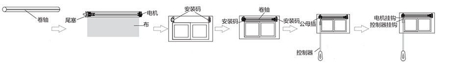 1. 準備Φ40mm卷軸, 長度=總長-25mm,卷軸內(nèi)外邊緣毛刺清理干凈, 確保卷軸內(nèi)壁清潔。2. 將尾塞、布、電機裝入卷軸內(nèi)。3. 將安裝碼固定于墻上。4. 把卷軸裝入安裝碼上。5. 將M2504EB控制器與M2504EB電機的對接口的公母插對接。6. 將M2504EB控制器掛鉤掛入M2504EB電機掛鉤內(nèi)。